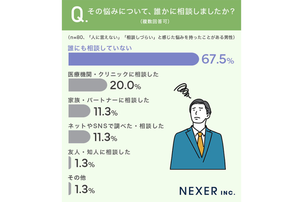 機能については「早漏ではないかという不安」(50代)、「EDになり自信がなくなった」(40代)、薄毛・抜け毛は「いつも帽子で隠しているが頭頂部がかなり薄くなってきた」(50代)、「20代後半から薄毛」(同)、メンタル面では「人前に出るのが極端に苦手」(30代)、「そううつ病で理解されにくい」(40代)などの具体的な声が寄せられていますが、医療機関に相談した方はわずか20%に留まっているのが現状です。